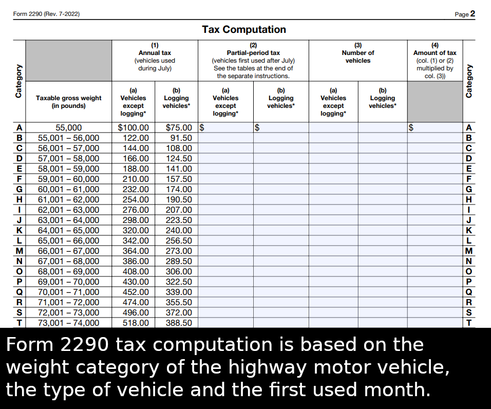 The excise tax is based on the weight of the vehicle. You do not have to pay the tax on a vehicle that weighs less than 55,000 pounds. This tax applies to vehicles used for farming and those used for non-farming purposes such as construction or transportation. Failing to file this form can result in penalties and interest, so make sure to fulfill your duty as a responsible business owner and file your 2290 form on time. Don't wait until it's too late.